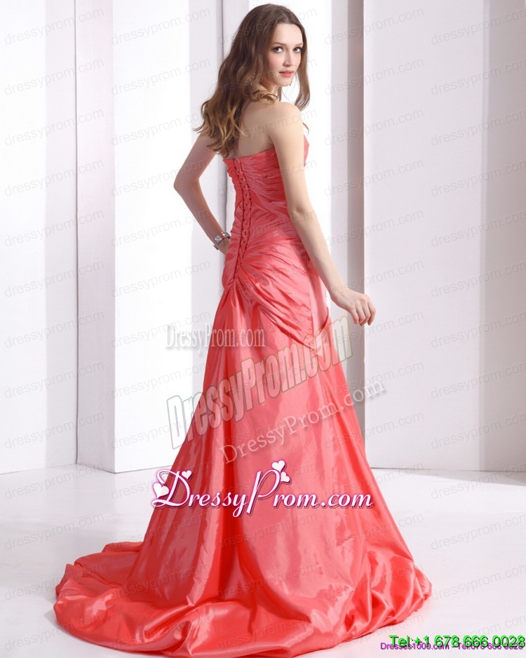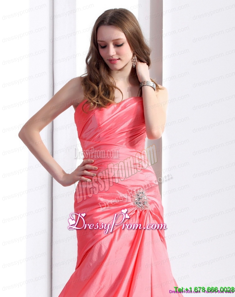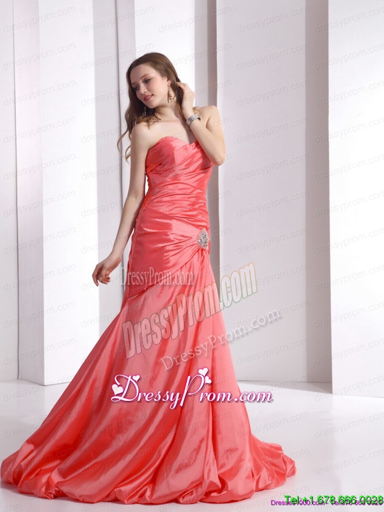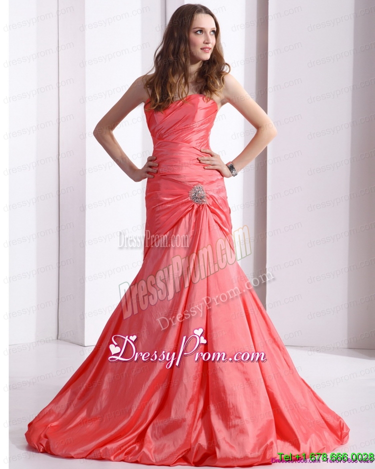 Neckline : SweetheartShown Color : Watermelon RedSilhouette : MermaidSleeve Length : sleevelessHemline : with trainBack Detail : Lace upFabric : TaffetaEmbellishment : Beading,RuchingOccasion : Prom,Party,Cocktail,Homecoming,GraduationSeason : Spring,Summer,Fall,Winter
