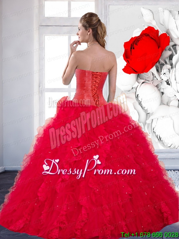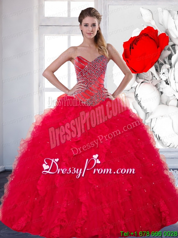Neckline : SweetheartShown Color : RedSilhouette : Ball GownsSleeve Length : sleevelessHemline : floor lengthBack Detail : Lace upFabric : OrganzaEmbellishment : Beading,RufflesOccasion : Graduation,Military Ball,Sweet 16,QuinceaneraSeason : Spring,Summer,Fall