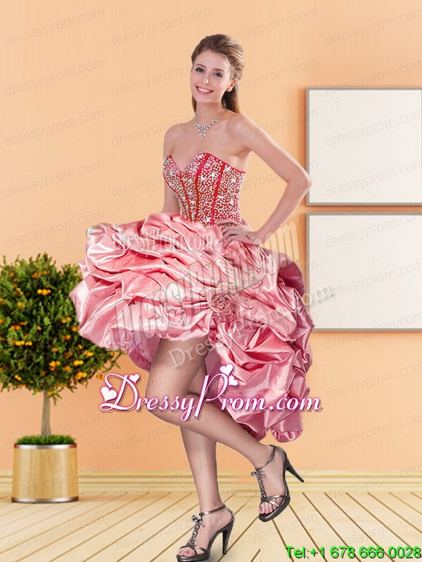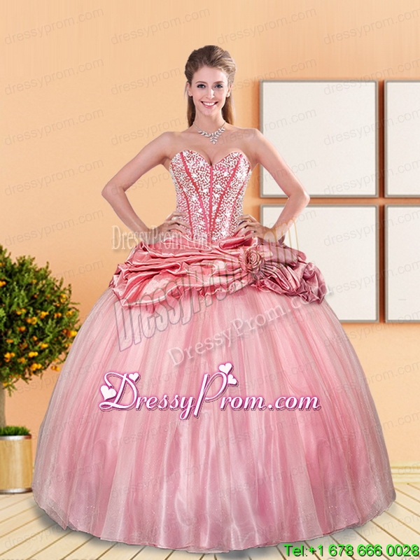 Neckline : SweetheartShown Color : Rose Pink Silhouette : Ball GownsSleeve Length : sleevelessHemline : floor lengthBack Detail : Lace upFabric : Taffeta,TulleEmbellishment : Beading,Pick UpsOccasion : Formal Evening,Graduation,Military Ball,Sweet 16,QuinceaneraSeason : Spring,Summer,Fall,Winter