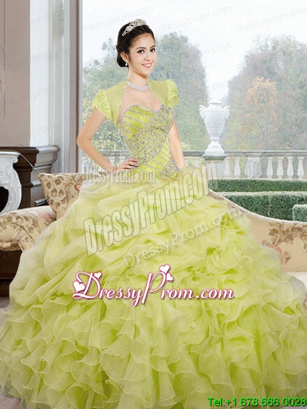 Neckline : SweetheartShown Color : Yellow GreenSilhouette : Ball GownsSleeve Length : sleevelessHemline : floor lengthBack Detail : Lace upFabric : OrganzaEmbellishment : Beading,Ruffles,Pick UpsOccasion : Military Ball,Sweet 16,QuinceaneraSeason : Spring,Summer,Fall,Winter