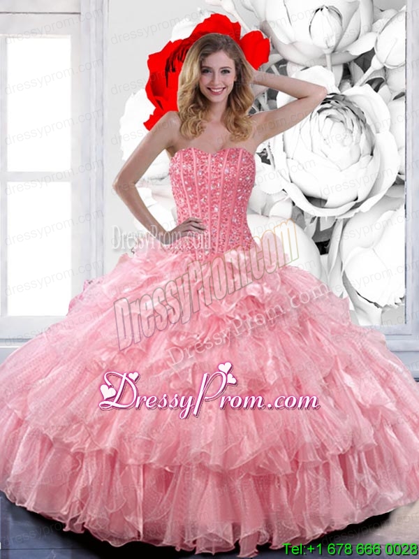 Neckline : SweetheartShown Color : Pink Silhouette : Ball GownsSleeve Length : sleevelessHemline : floor lengthBack Detail : Lace upFabric : OrganzaEmbellishment : Beading,RufflesOccasion : Military Ball,Sweet 16,QuinceaneraSeason : Spring,Summer,Fall,Winter