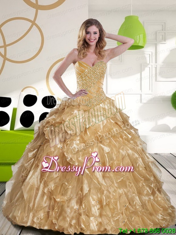 Neckline : SweetheartShown Color : ChampagneSilhouette : Ball GownsSleeve Length : sleevelessHemline : floor lengthBack Detail : Lace upFabric : OrganzaEmbellishment : Beading,RufflesOccasion : Military Ball,Sweet 16,QuinceaneraSeason : Spring,Summer,Fall,Winter